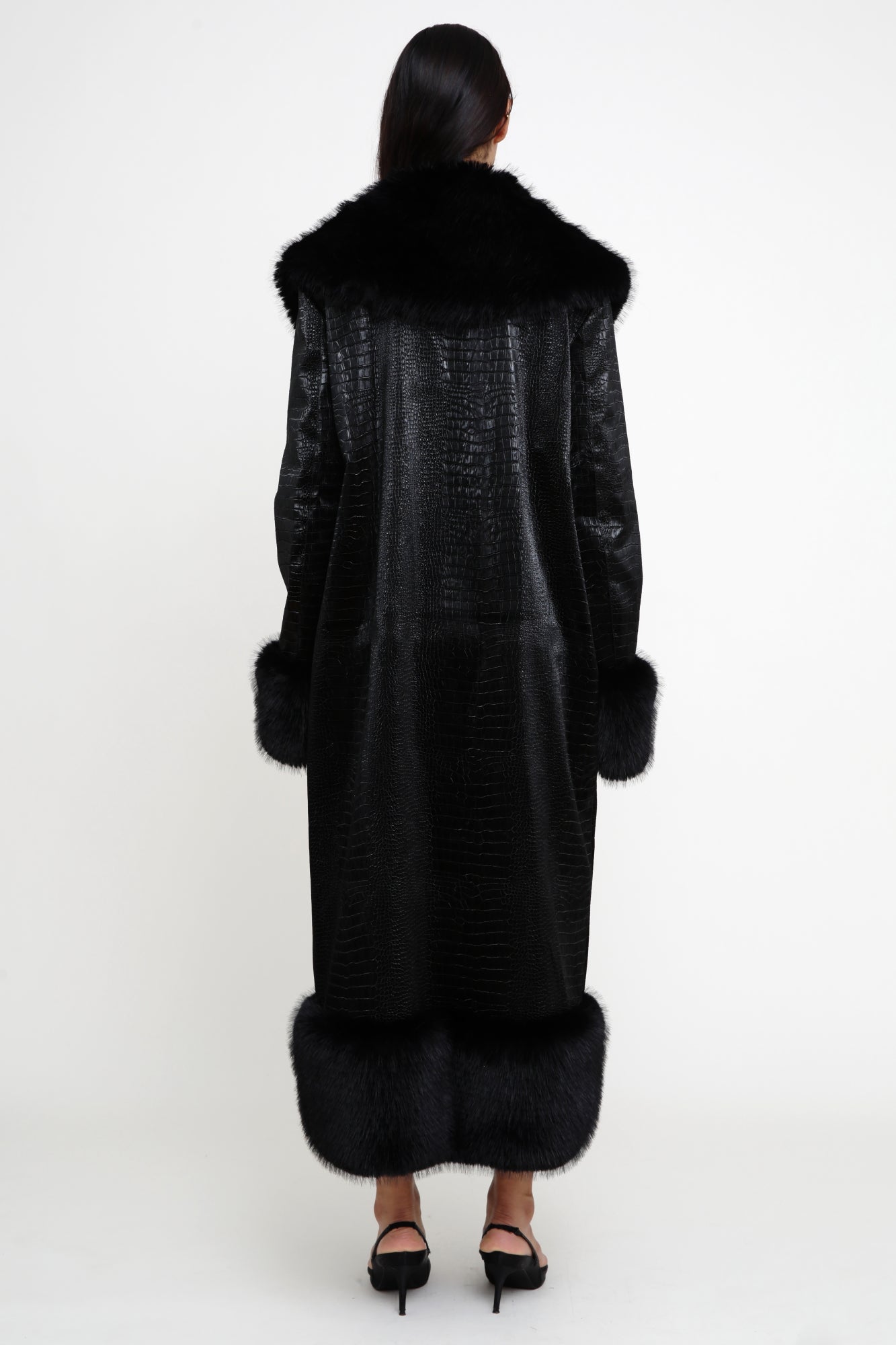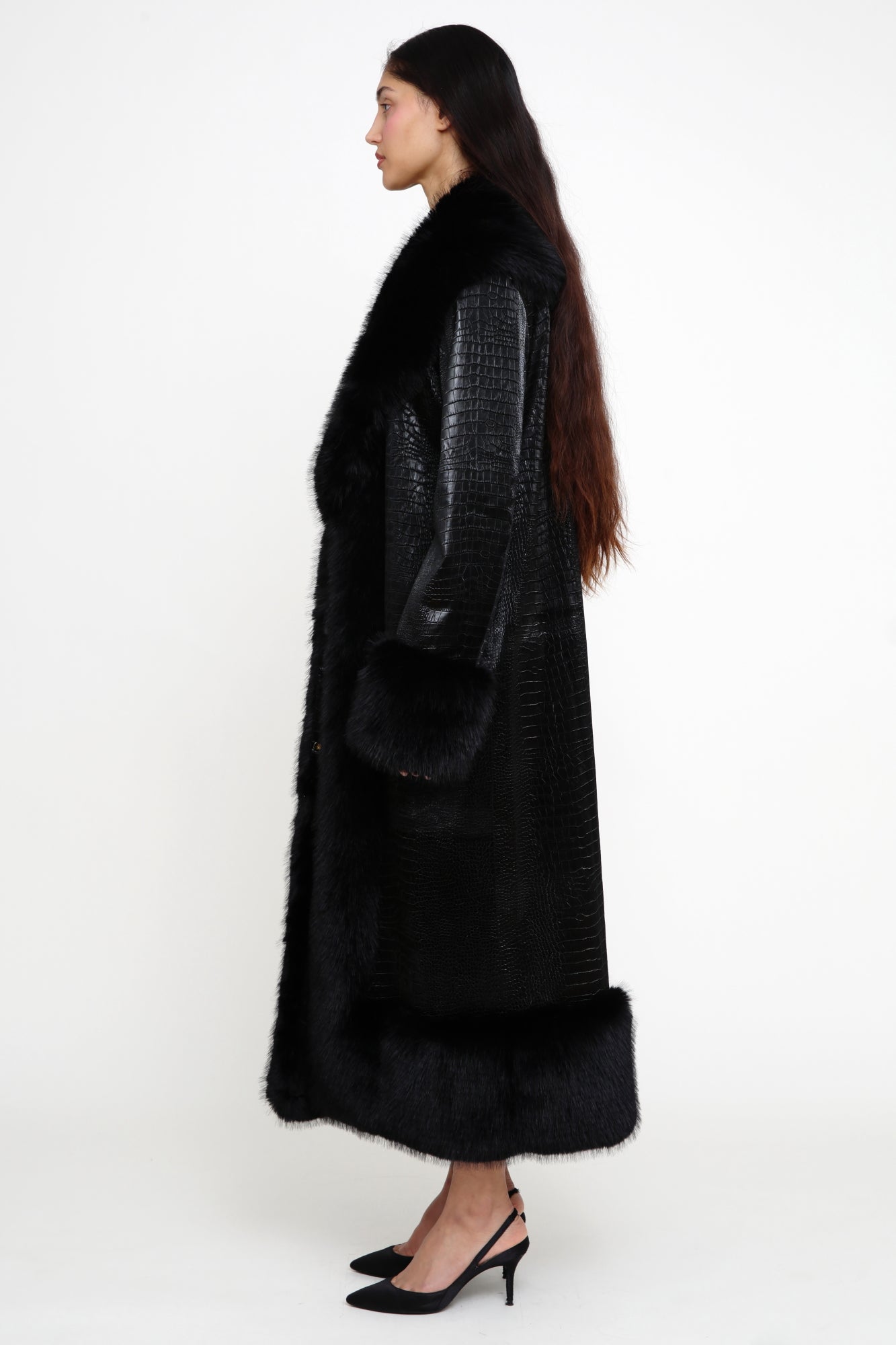 Make a bold statement this season with our oversized Black Faux Fur Trim Croc Coat. Designed with a sleek croc-embossed body and ultra-soft faux fur framing the collar, front, cuffs, and hem, this coat delivers warmth and high-impact style in one effortless piece. The full-length silhouette creates a streamlined look, while the oversized shawl collar adds a touch of luxury.