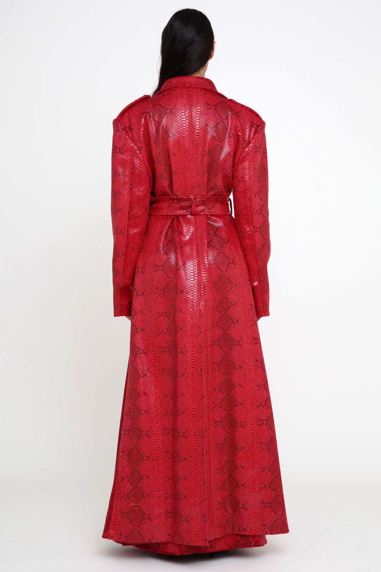 A striking red snake-embossed coat featuring a full-length A-line silhouette, wide lapels, and a matching self-tie belt. The glossy textured finish elevates the dramatic shape and adds a bold, sculptural edge.