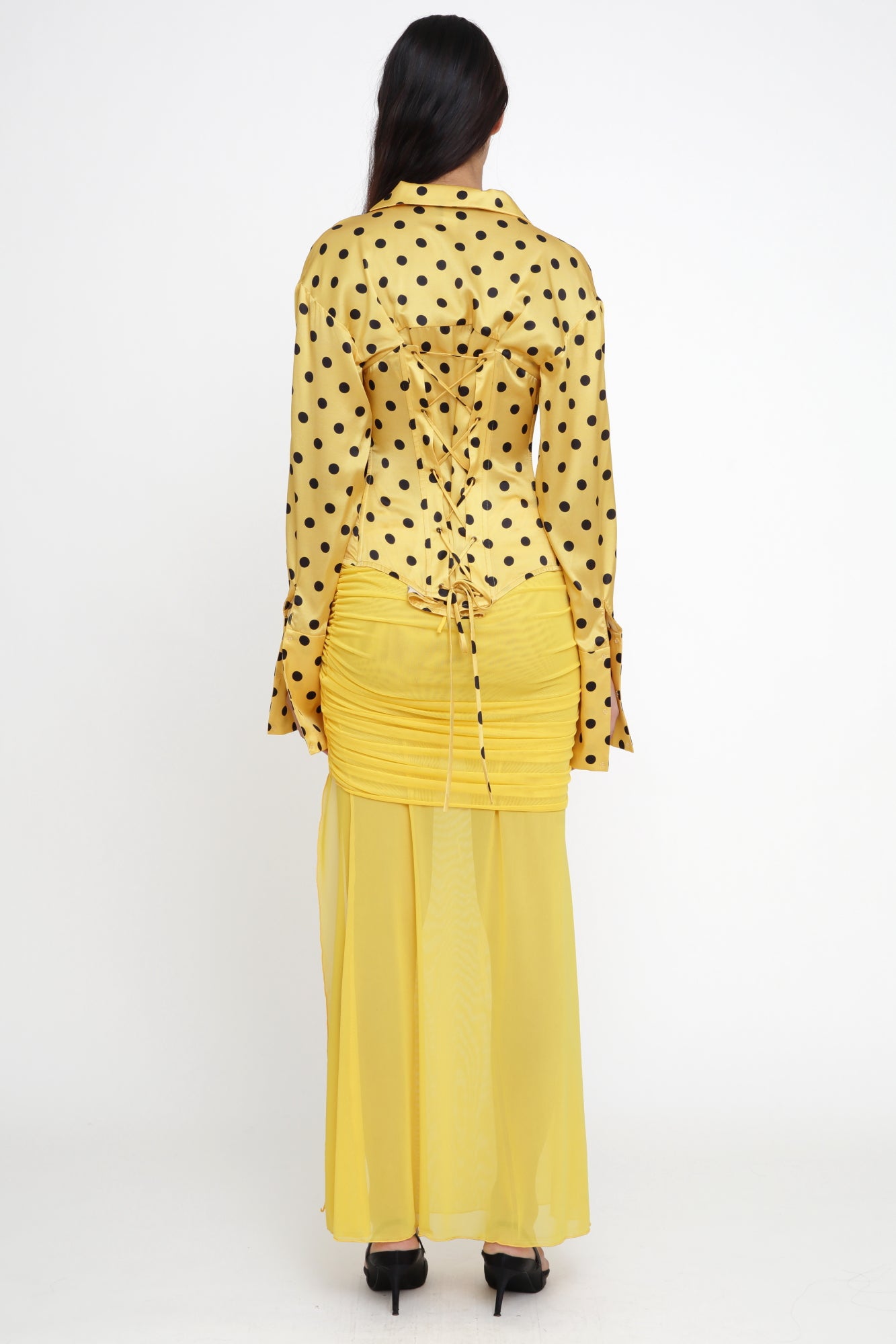 A yellow satin polka-dot blouse with a sculpted corset waist and flared cuffs.