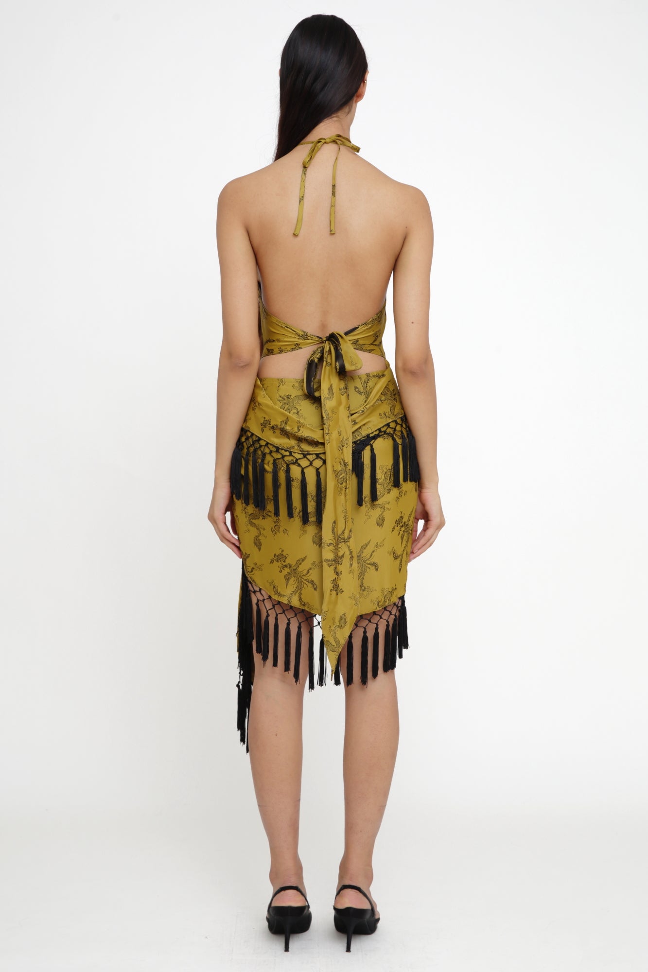 A modern halter top cut from golden brocade with delicate floral patterning. The neckline wraps elegantly, while the double-point hem creates a flattering, elongated silhouette. A statement piece with a refined, artisanal touch.